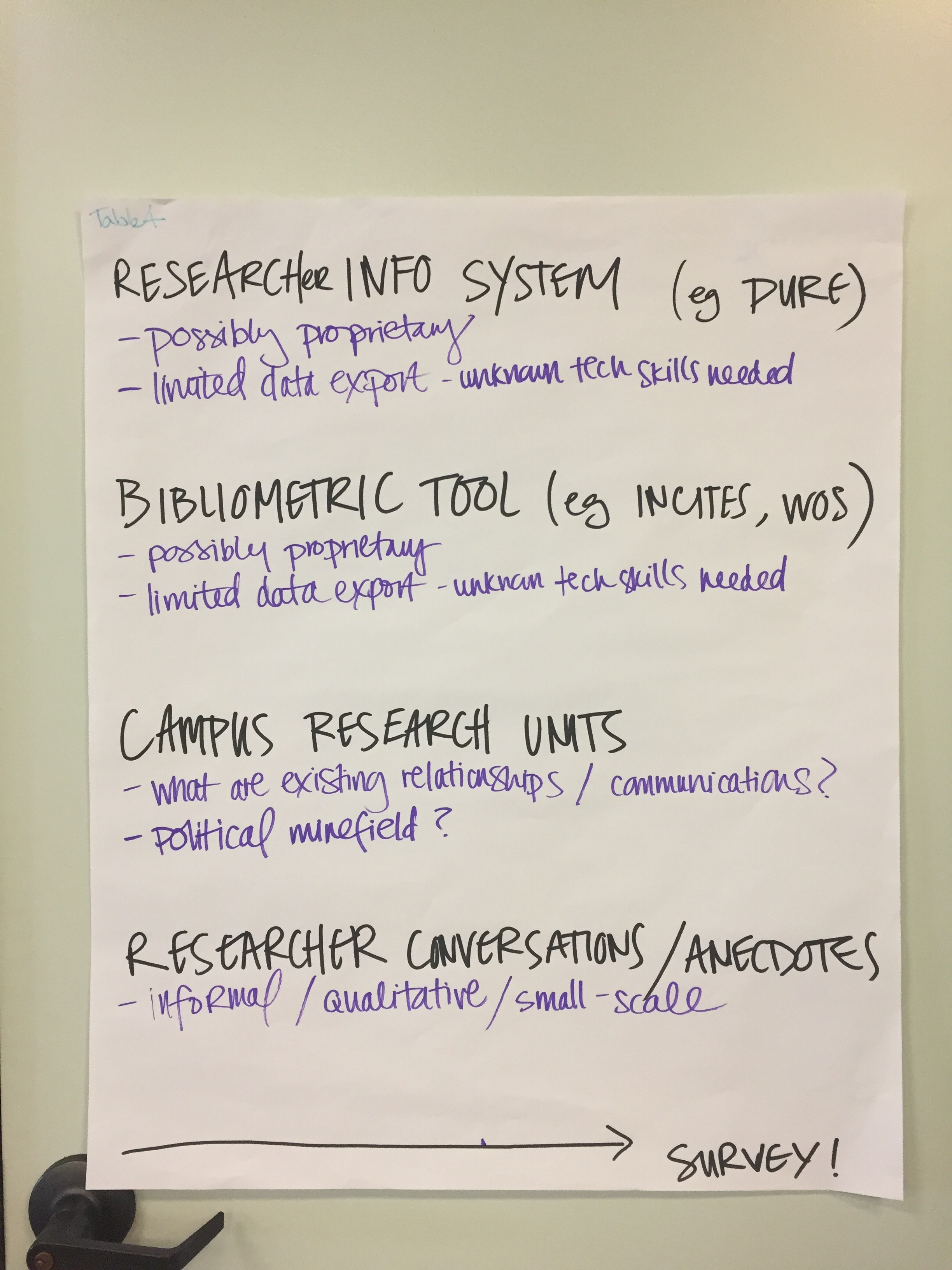 We started the day with a ‘gathering evidence’ exercise that consisted of a series of questions that were allocated to each table to discuss with a view to the kind of information held in an institution that might be helpful to answer it. Examples of the type of questions we asked the group to consider are: How do we better understand and communicate with the range of disciplines on campus? (with a goal of creating advocacy materials that support the range of disciplinary needs of the institution) or Who is doing collaborative research with others on campus and with others outside of the university? Is there interdisciplinary research? (with a goal of creating a map of collaborations on campus).