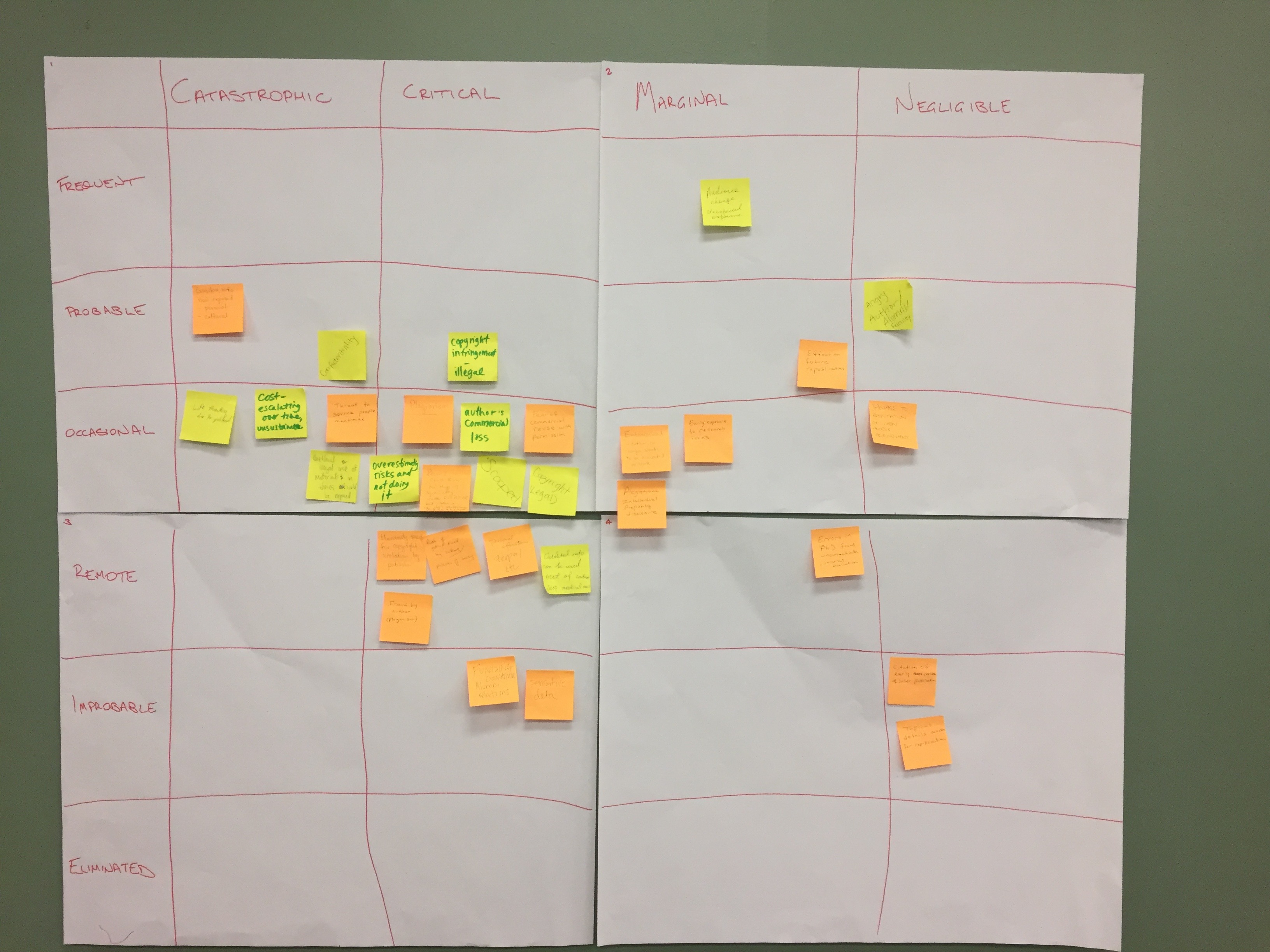 The final session on day three was a risk assessment exercise where we put up the proposal ‘that we will make all digitised older theses open access without obtaining permission from the authors’. The tables were asked to come up with potential risks that could arise from this proposal, and then asked to map these onto a grid that considered the likelihood and severity of each risk.
