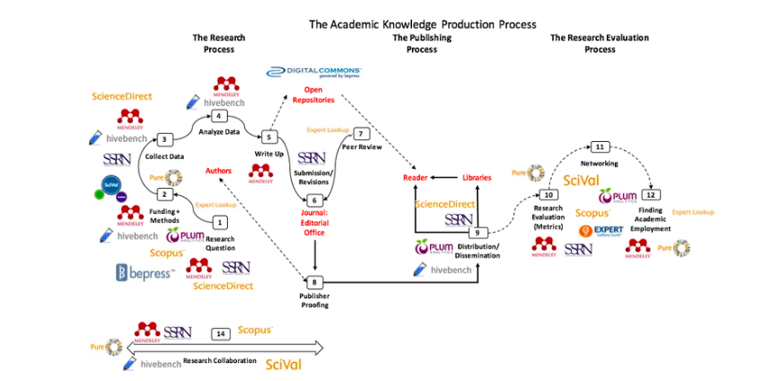 Possibly the most dramatic way to illustrate the extent of the situation is a graphic showing where Elsevier-owned products sit throughout the research lifecycle, appearing in Rent Seeking and Financialization strategies of the Academic Publishing Industry – Publishers are increasingly in control of scholarly infrastructure and why we should care- A Case Study of Elsevier.