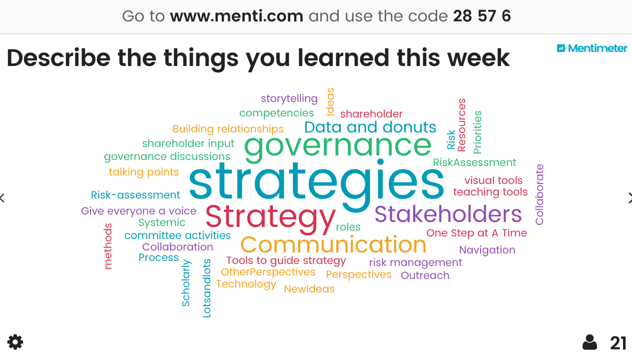 Each group chose one of these issues/futures, and in a mini overview of the work we had done throughout the week, they undertook a stakeholder assessment – who would they have to engage to make this happen? They also identified the governance structures in place, and the type of information they would want in place to make decisions about moving in this area. Sone of the discussions are captured in the slides.